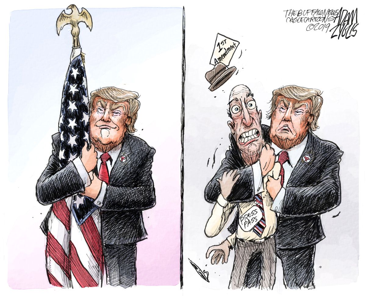 Political Cartoon U S Trump flag hug media first amendment The Week