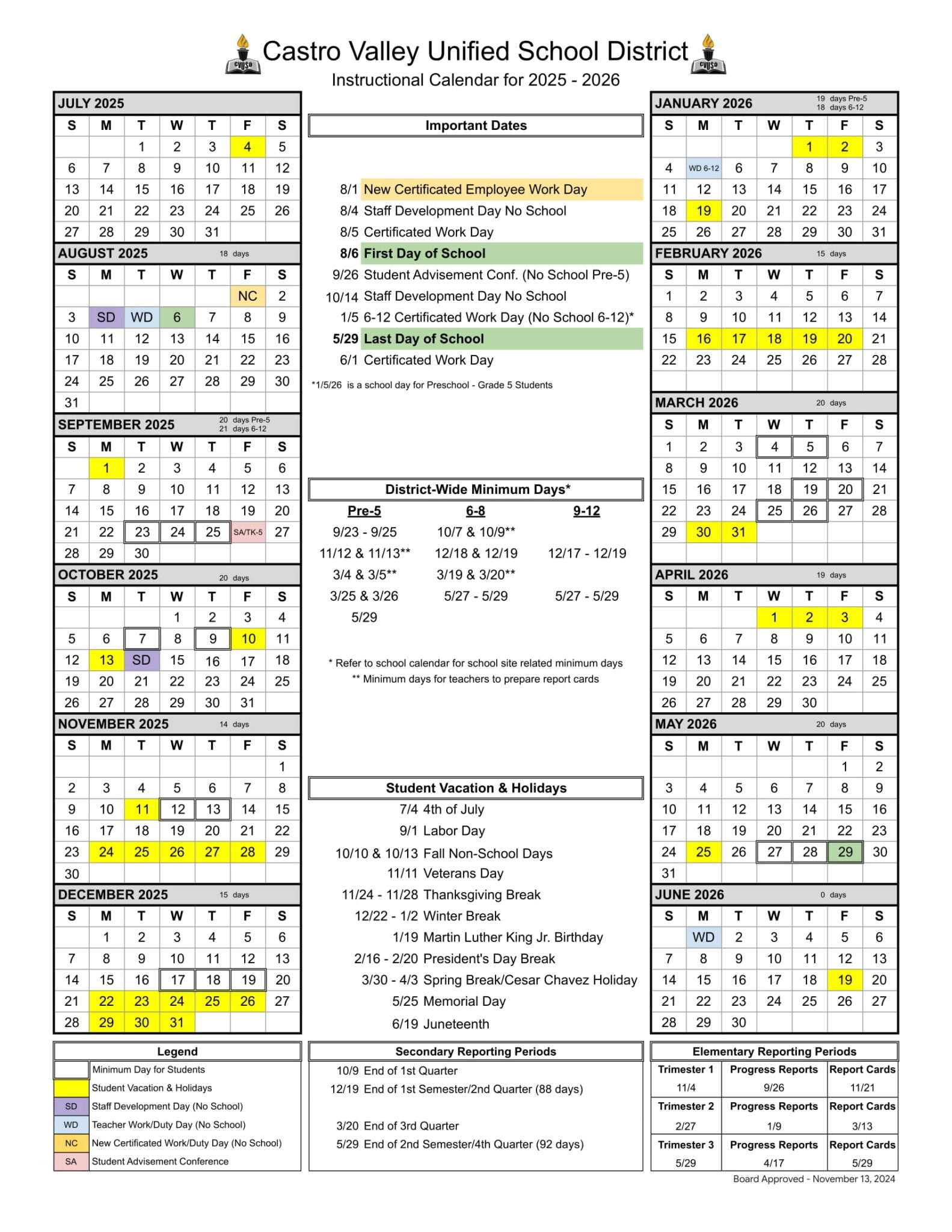 Castro Valley Unified School District Calendar 25 26 PDF EduCounty