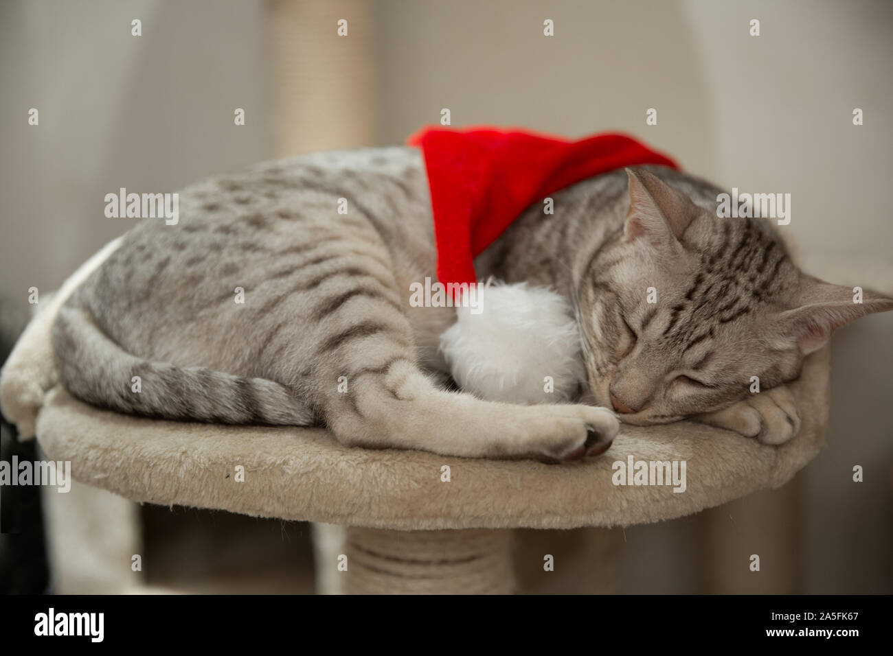 Cat ocicat in Christmas with red hat peacefully sleeping on his own