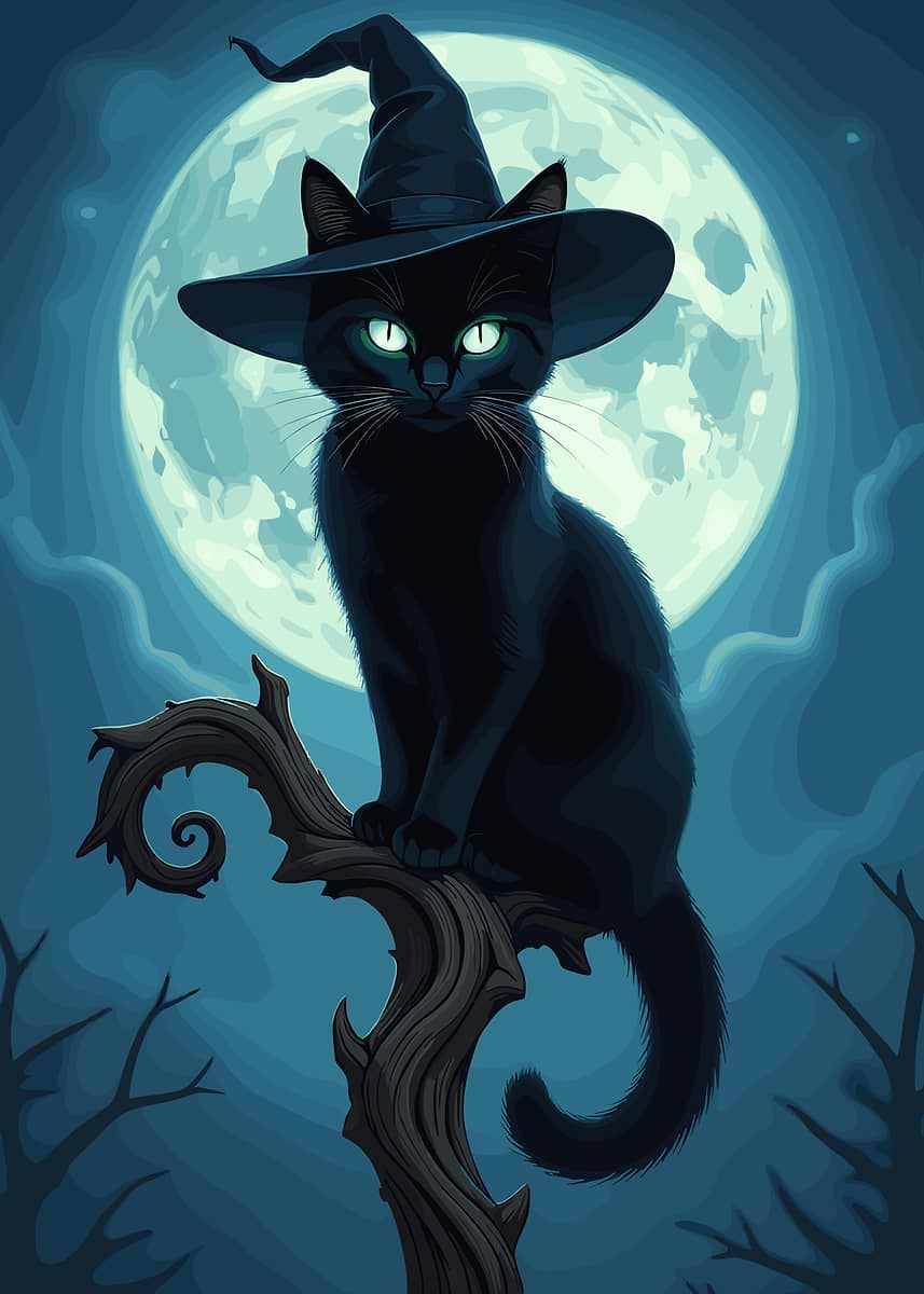 #39 Black Cat in Witch Hat Under Moon #39 Poster picture metal print paint