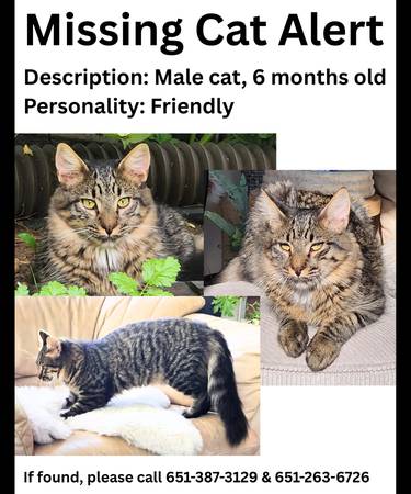Missing Cat Alert Description: Male cat 6 months old Personality: Fri