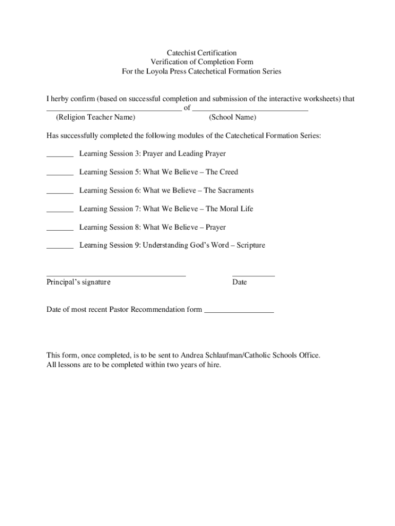 Fillable Online Parish Catechist Certification Log Intermediate Please