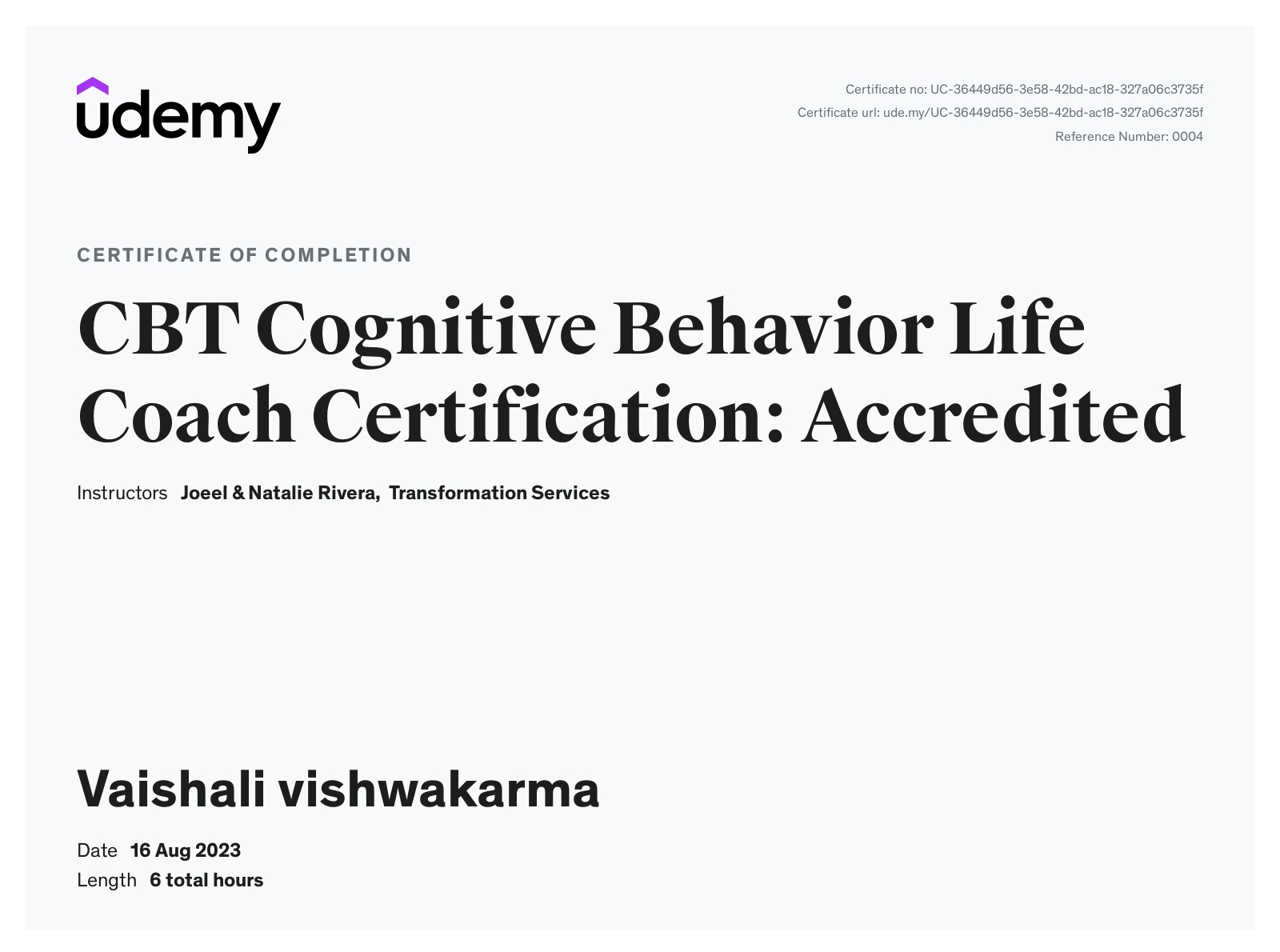 Another Internationally Accredited Certificate: Certified CBT life