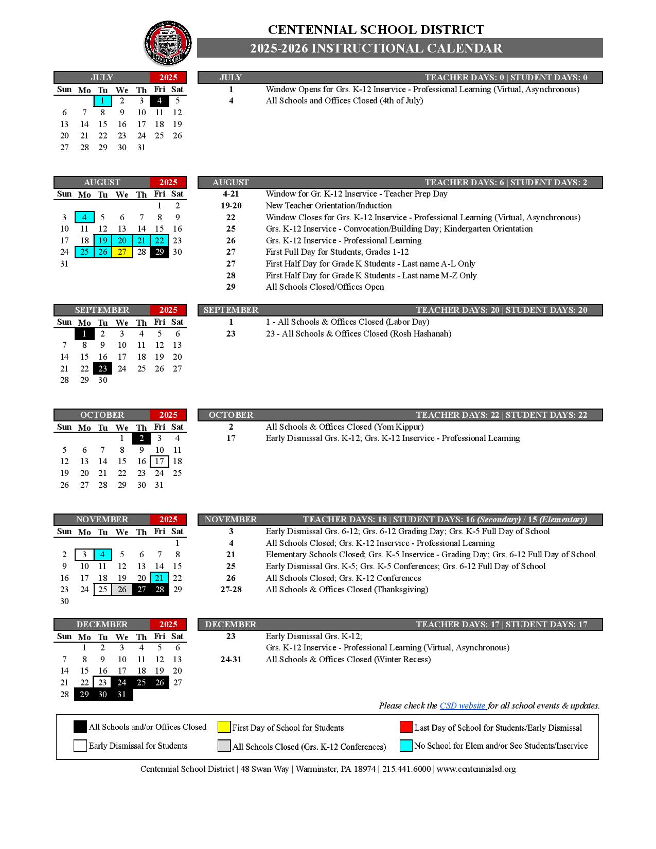 Centennial School District Calendar 2025 2026 Pennsylvania