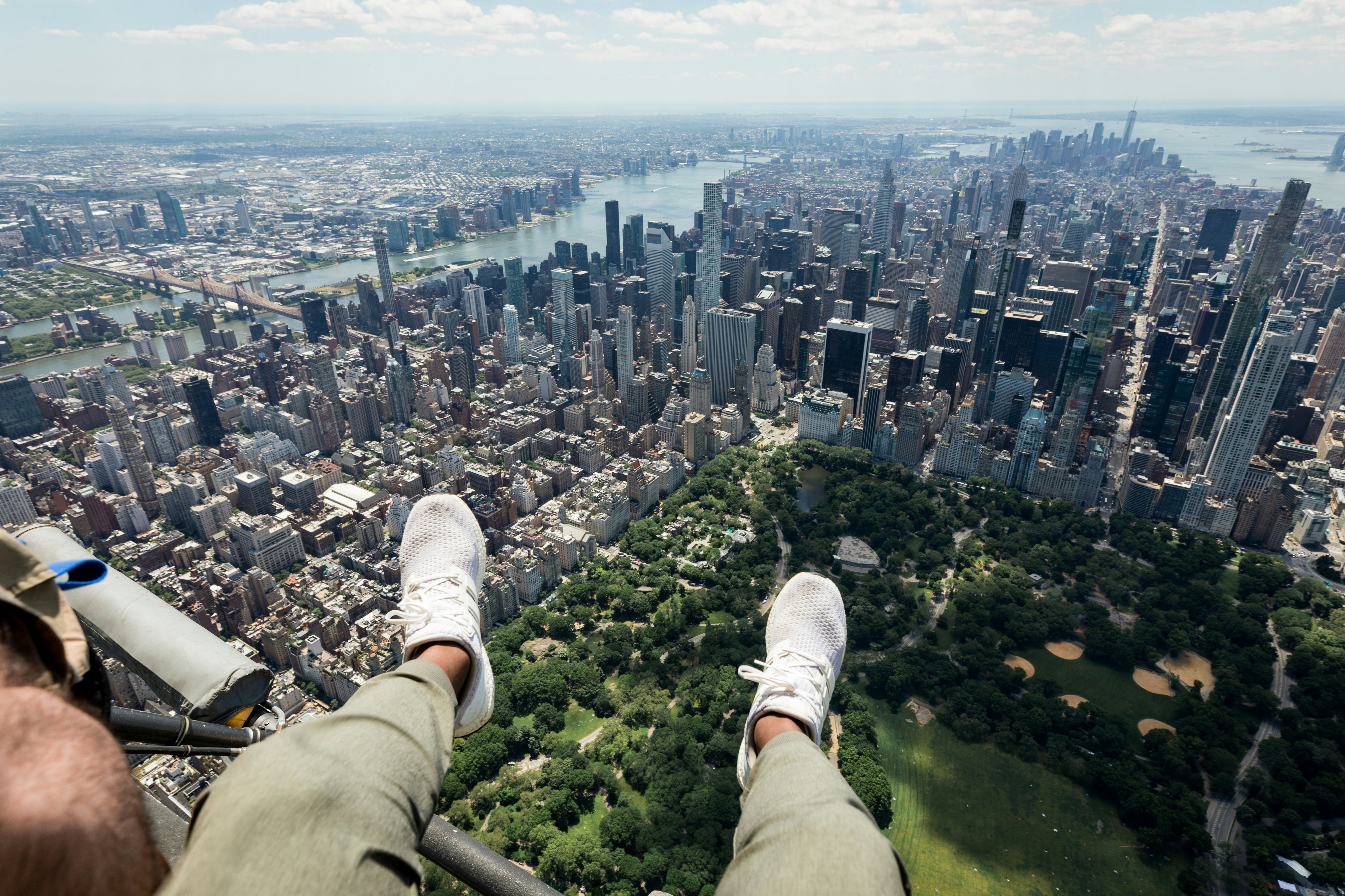 Person in white sneakers sitting on top of the mountain during daytime