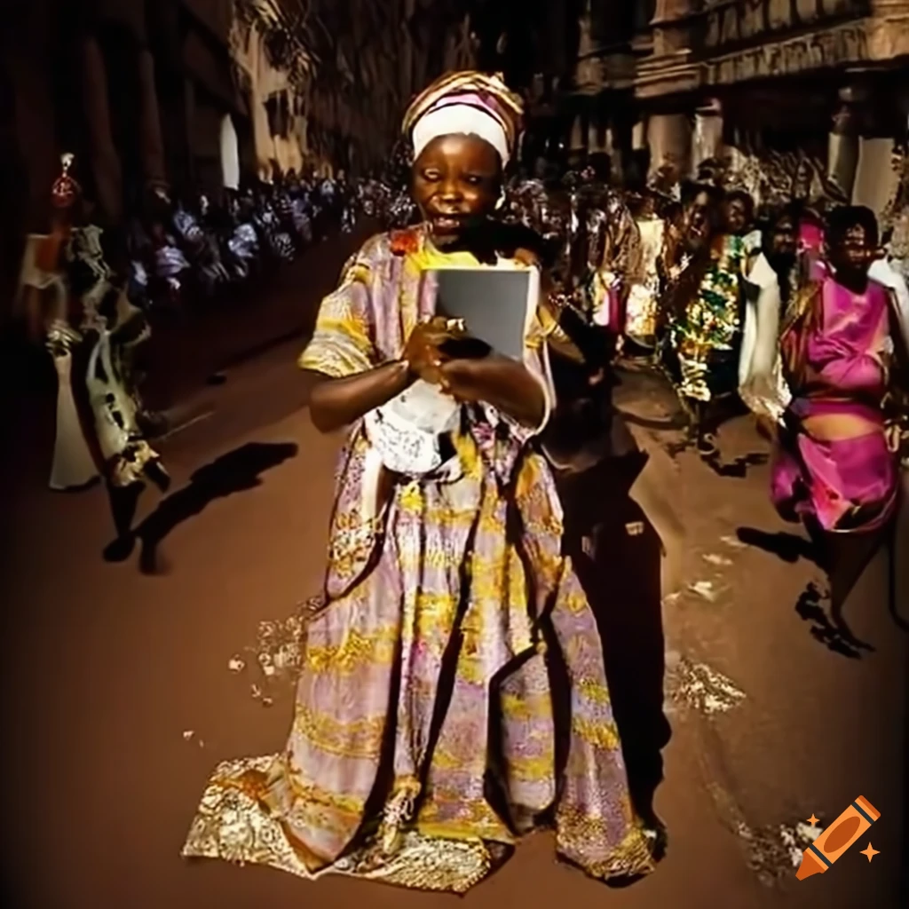 African priestess carrying an ipad in a ceremonial procession on Craiyon