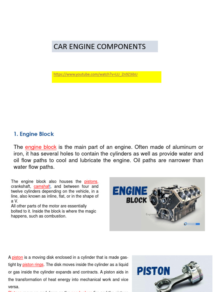 Car Engine Components PPT SS and Quiz PDF Internal Combustion
