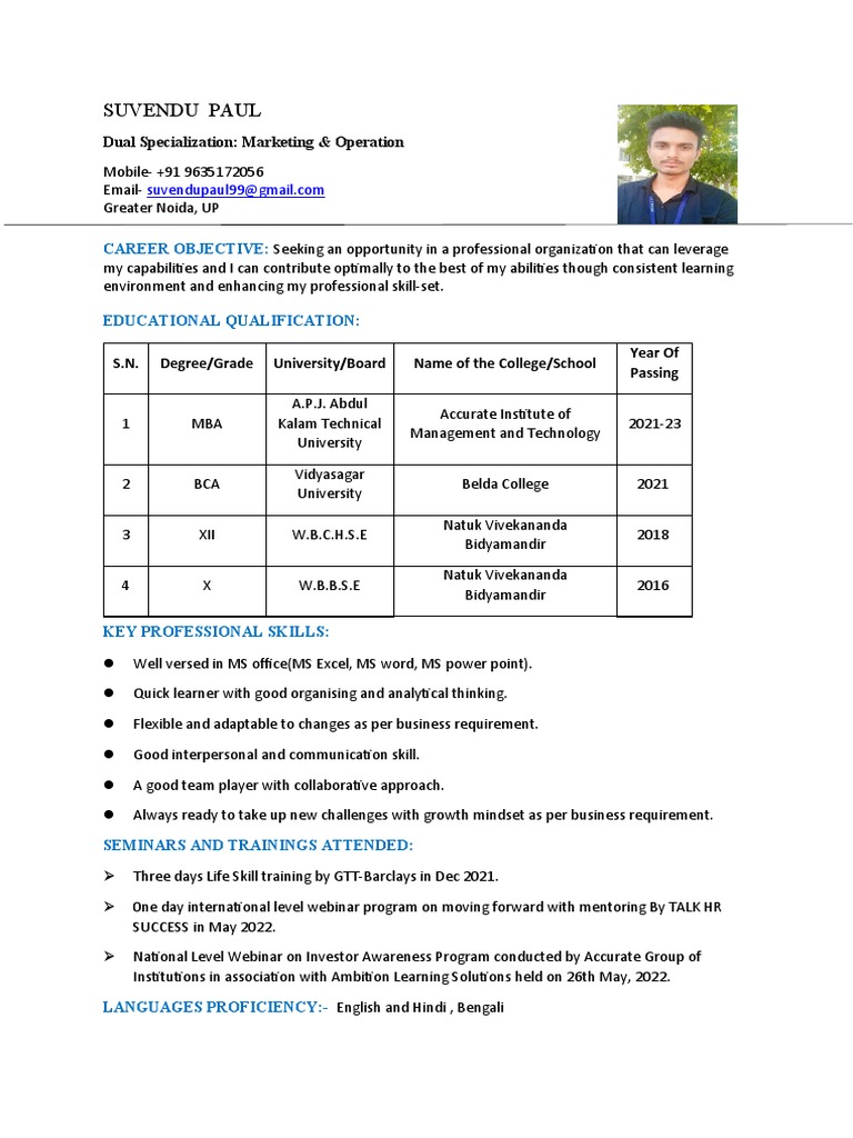 Resume Suvendu Paul Certificate PDF Cognitive Science Linguistics