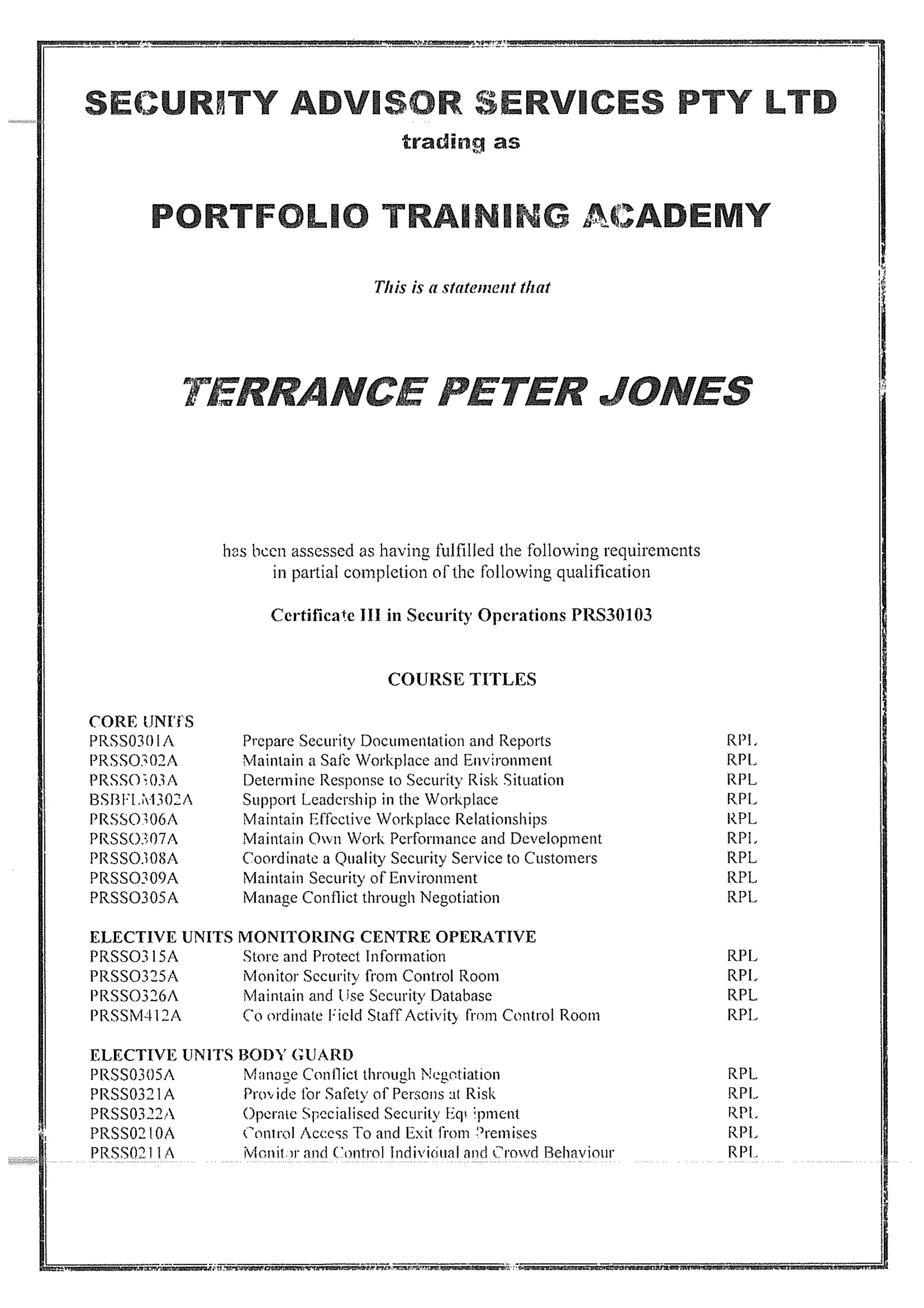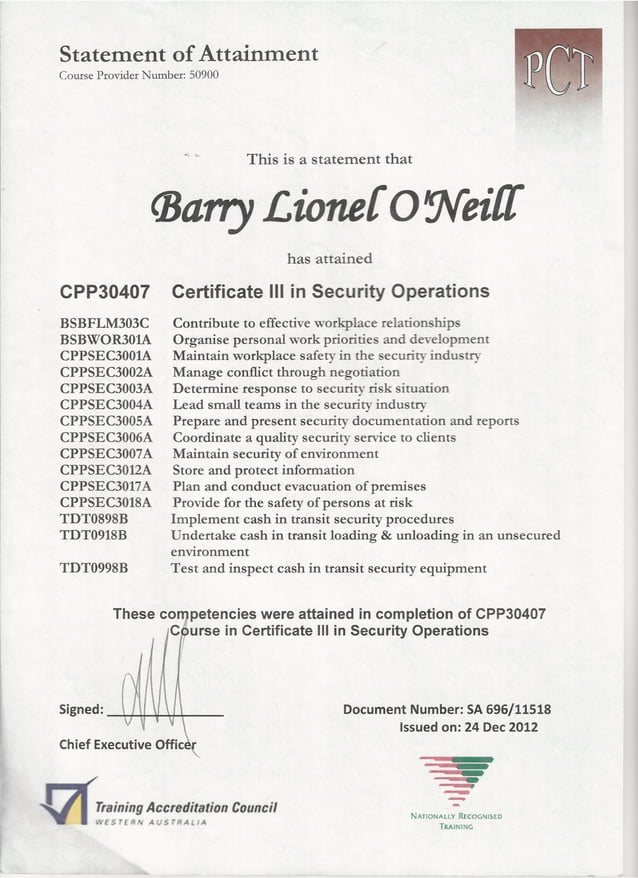 Statement of Attainment Certificate II in Security Operations Covering