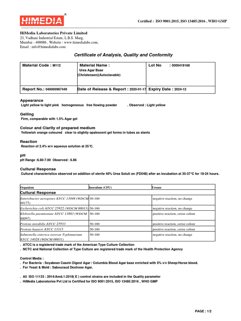 Certificate of Analysis Quality and Conformity: Himedia Laboratories
