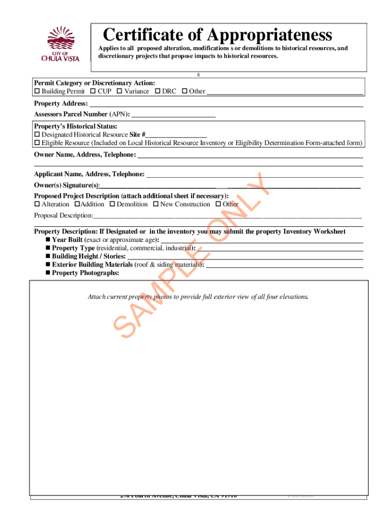 Fillable Online SAMPLE APPLICATION FOR A CERTIFICATE OF APPROPRIATENESS
