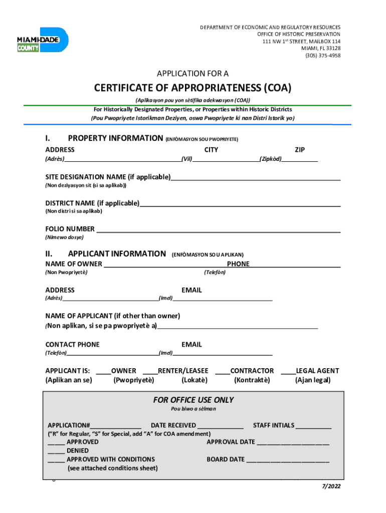 Fillable Online Certificate of Appropriateness (COA) Application and