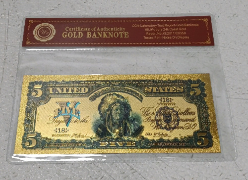 99 9% 24K GOLD 1899 $5 INDIAN CHIEF BILL US BANKNOTE IN PROTECTIVE