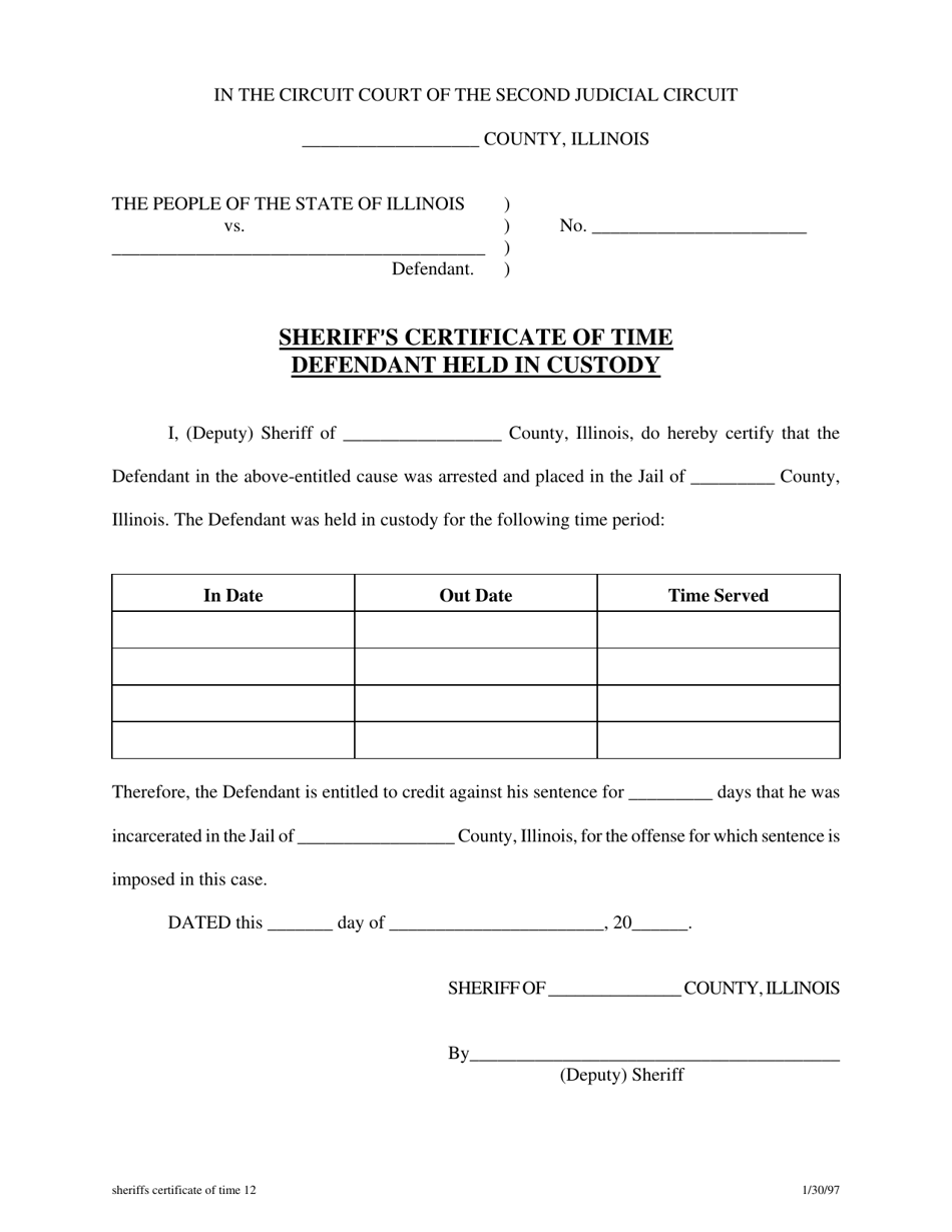 Illinois Sheriff #39 s Certificate of Time Defendant Held in Custody Fill
