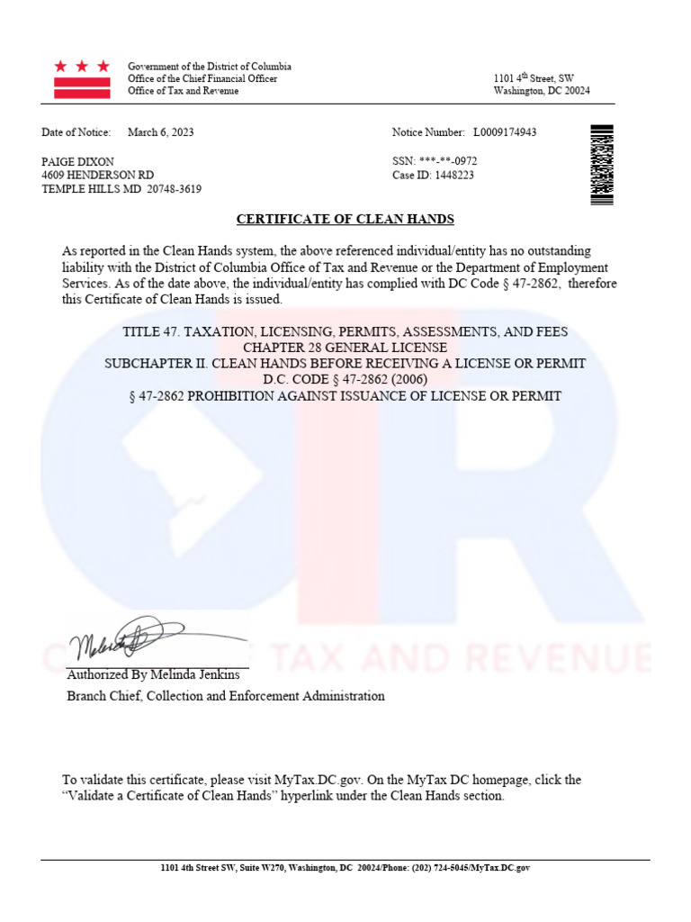 Certificate Of Clean Hands Dc