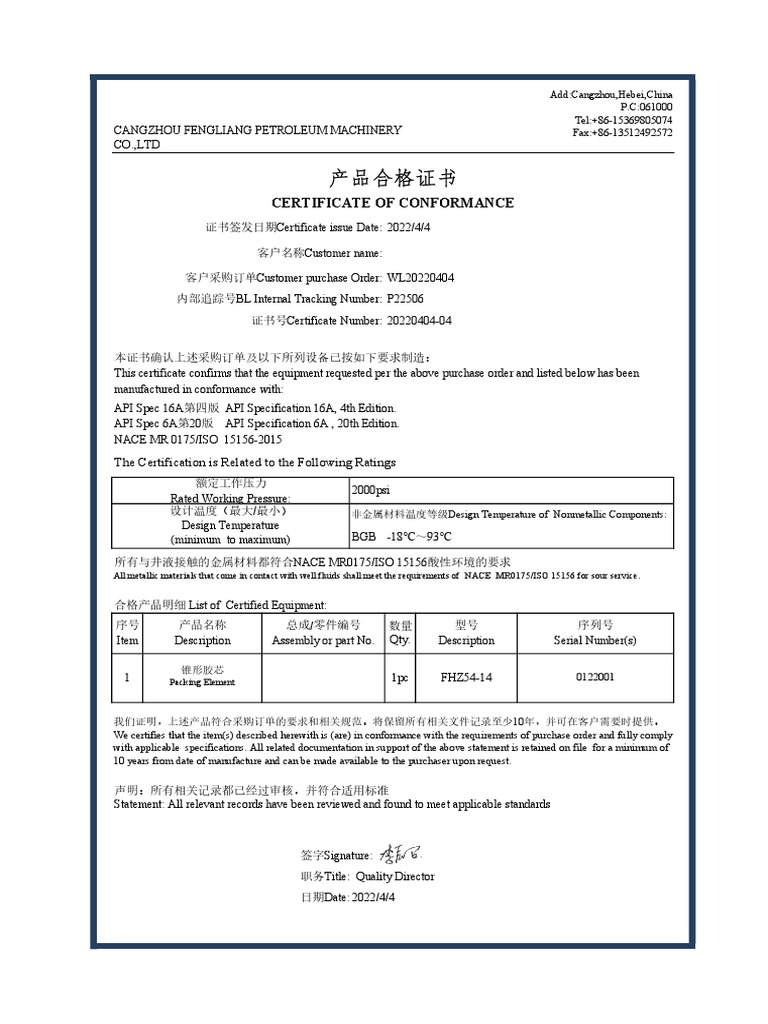 Certificate Of Conformance