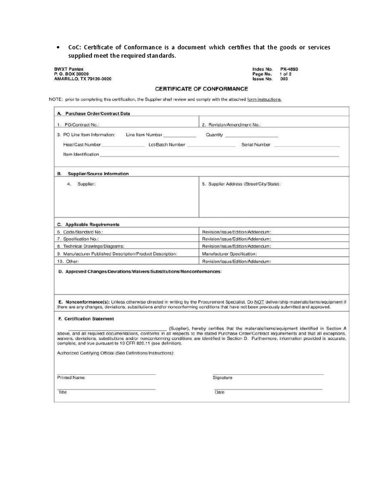 Certificate Of Conformance Template