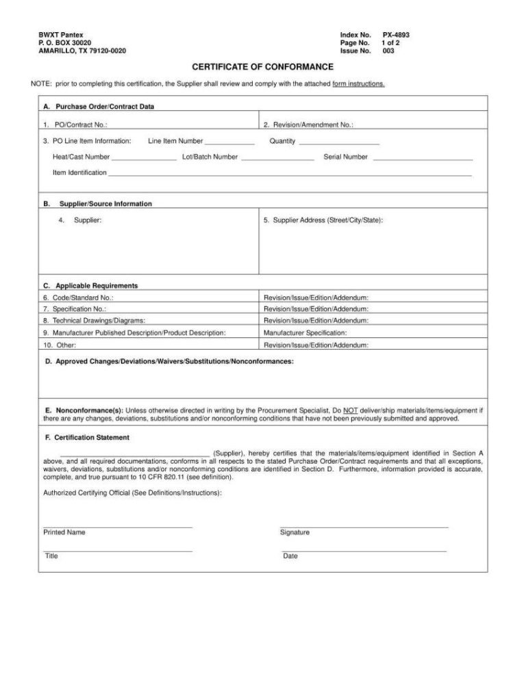 ? Blank Printable Certificate of Conformity COC Form Templates?