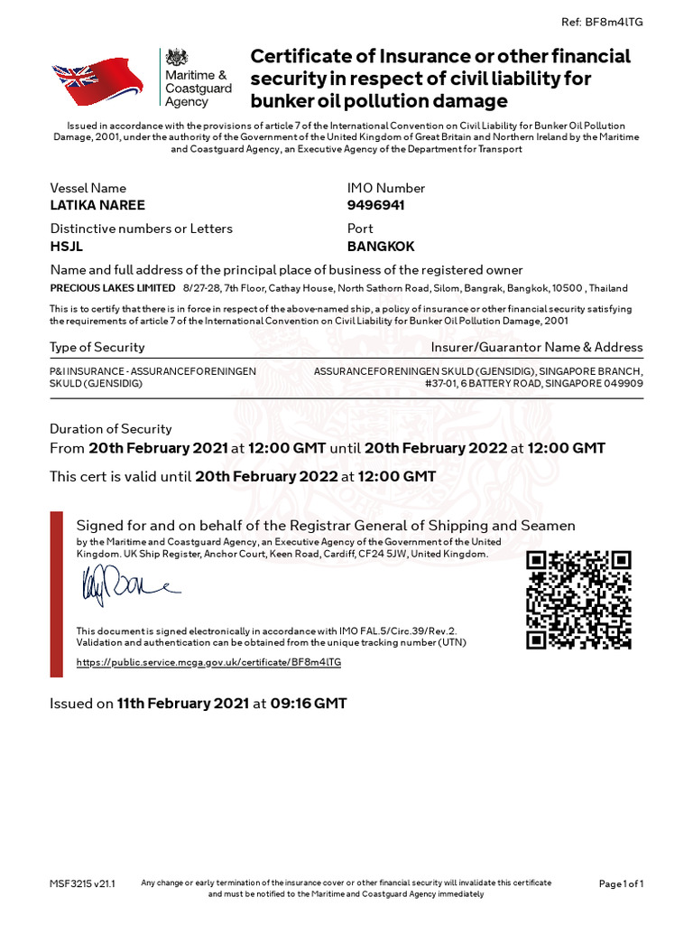 Certificate OF Insurance FOR Bunker OIL Pollution Damage CERTIFICATE