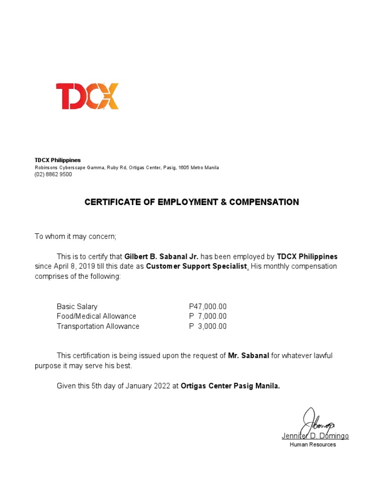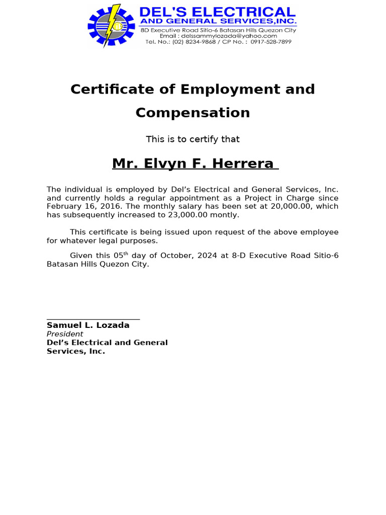 Certificate Of Employment With Compensation