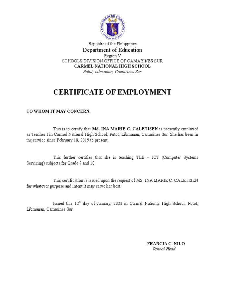 DepEd certificate of employment format docx
