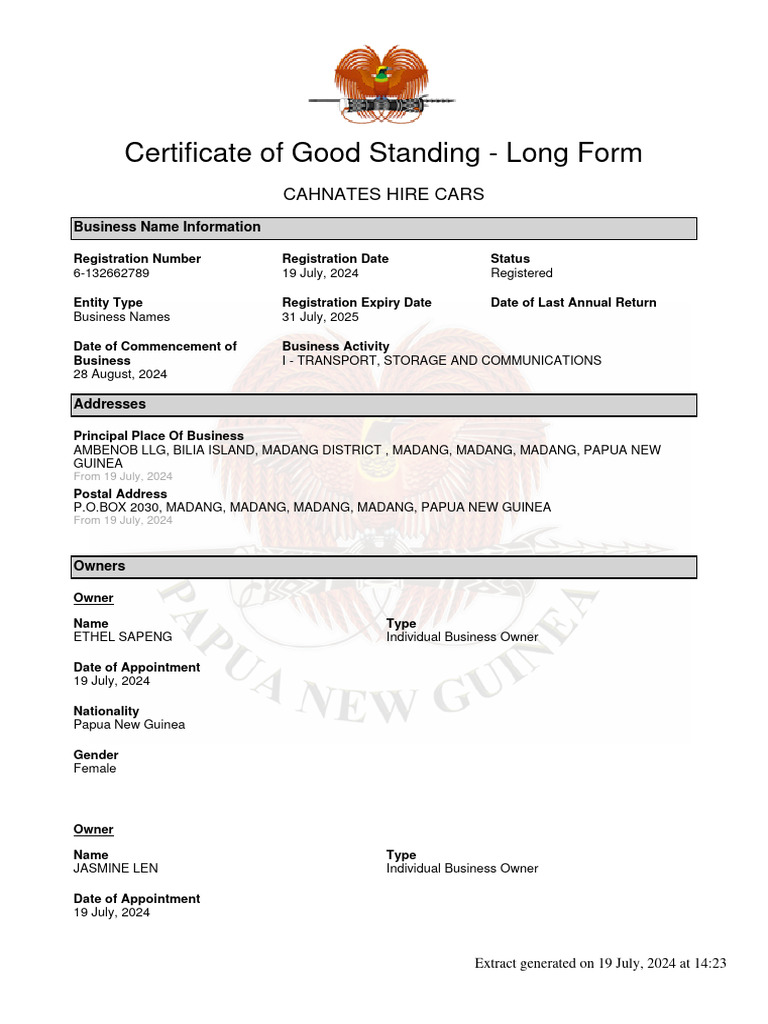 Certificate of Good Standing Business Names Long Form PDF