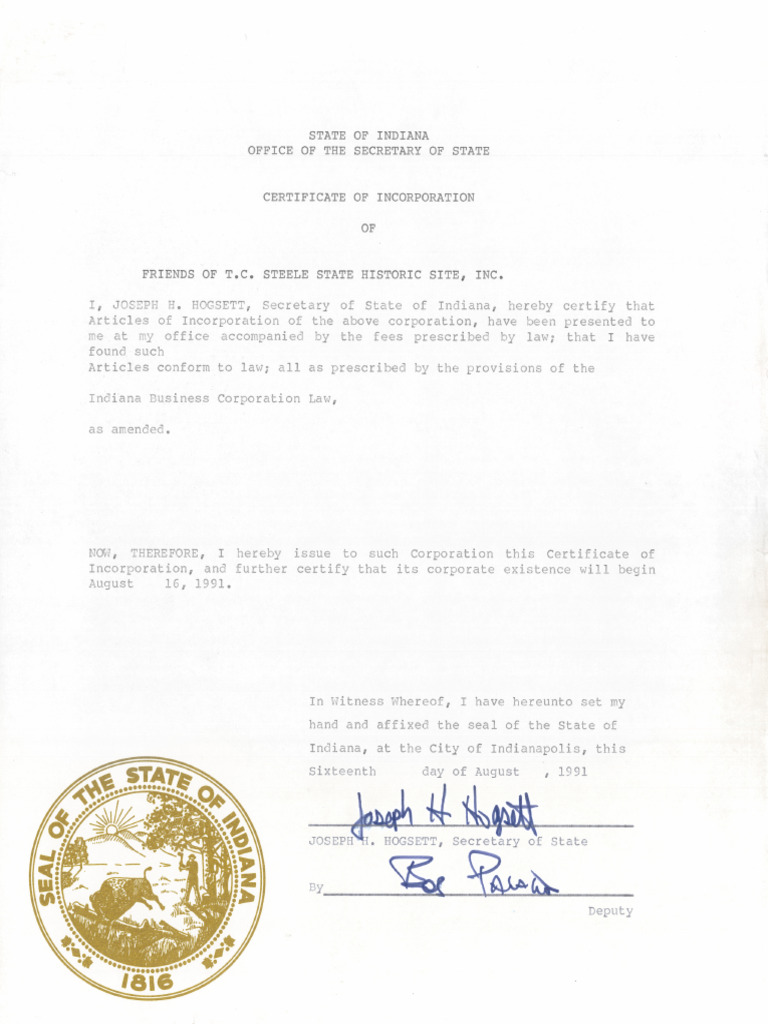 Certificate of Incorporation State of Indiana August 16 1991 PDF