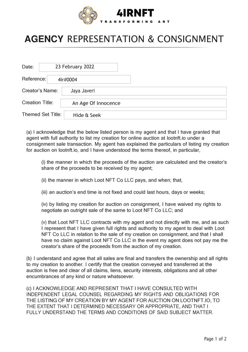Certificate of Authenticity and Consignment An Age Of Innocence