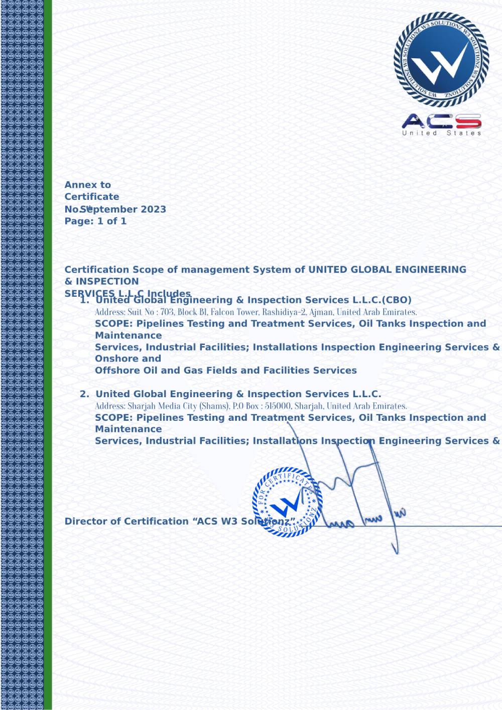 Certificate United Global Engineering Inspection Services LLC