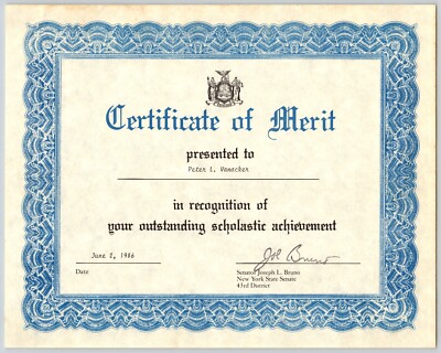 Certificate of Merit New York State Senate 1986 Senator Joseph L Bruno