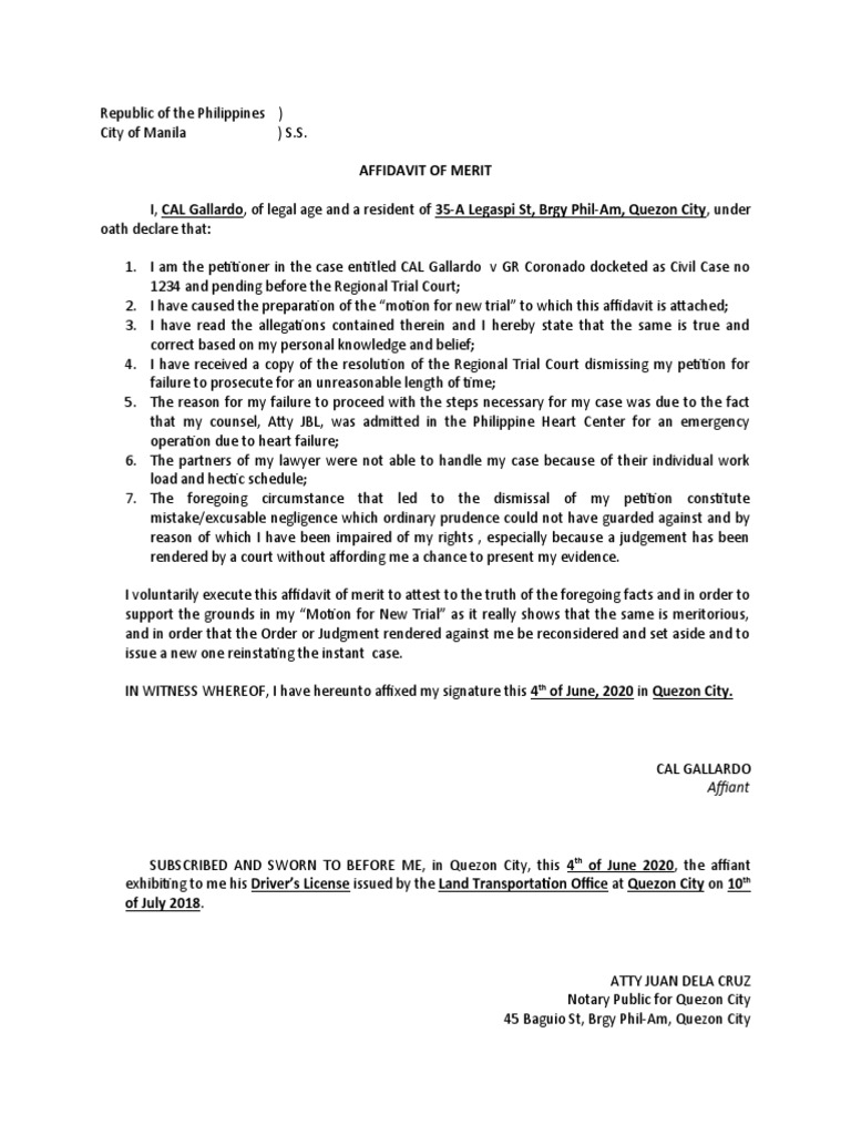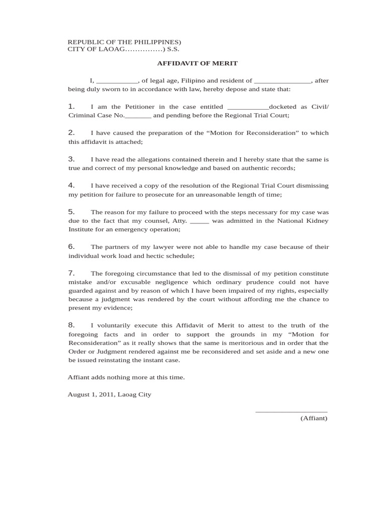 Affidavit of Merit Sample Affidavit Judgment (Law) Free 30 day