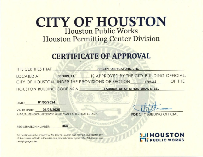 City of Houston Certification Certificate