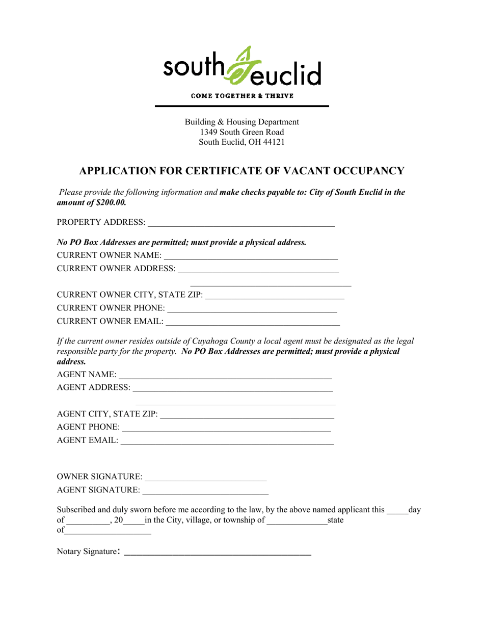 City of South Euclid Ohio Application for Certificate of Vacant