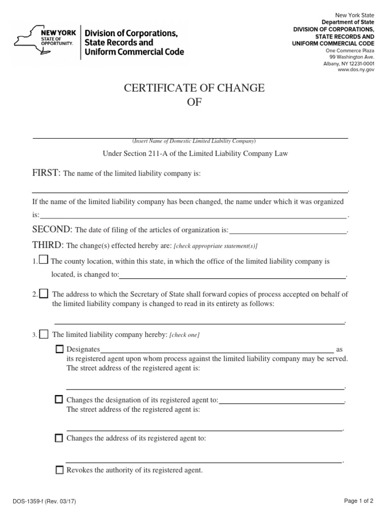 New York LLC Certificate of Change PDF Registered Agent Limited