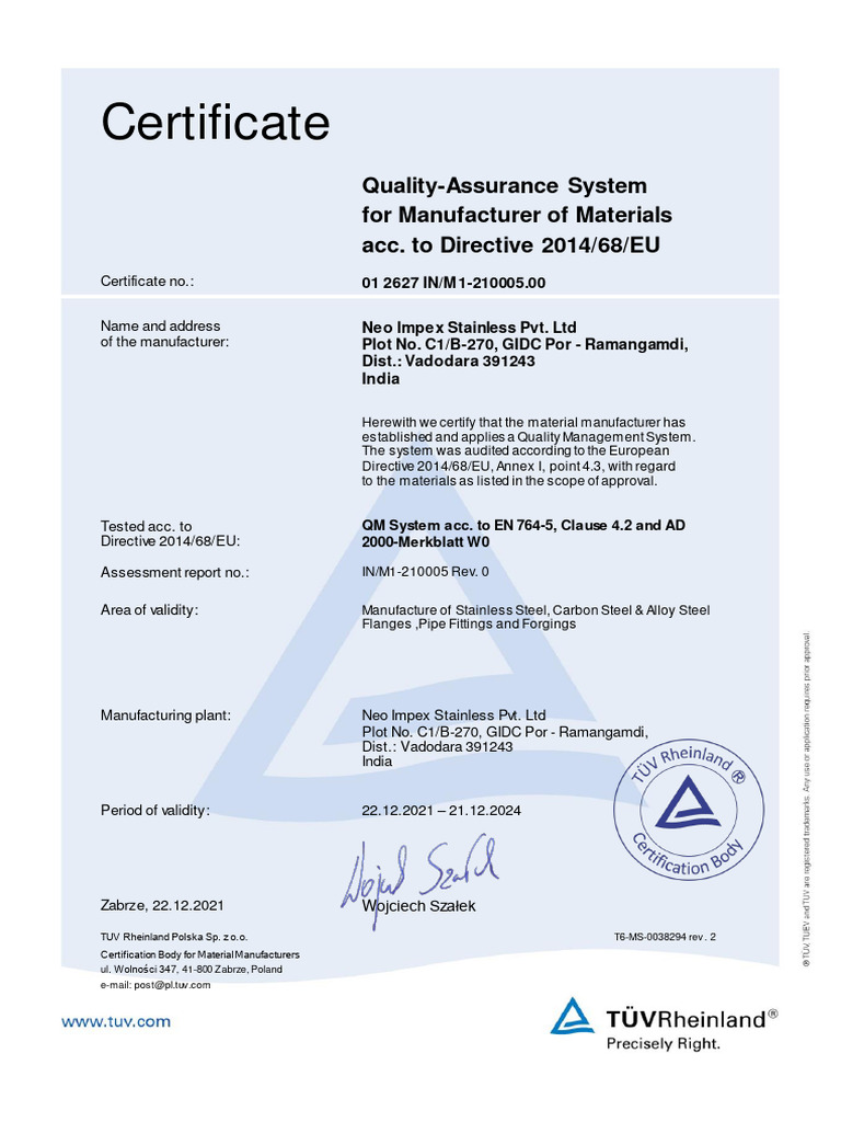 Certificate: Quality Assurance System For Manufacturer of Materials Acc