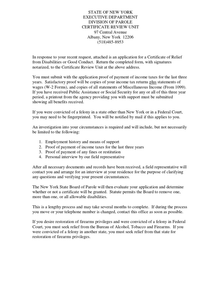 NY Certificate Relief Conduct Guide PDF Felony Irs Tax Forms