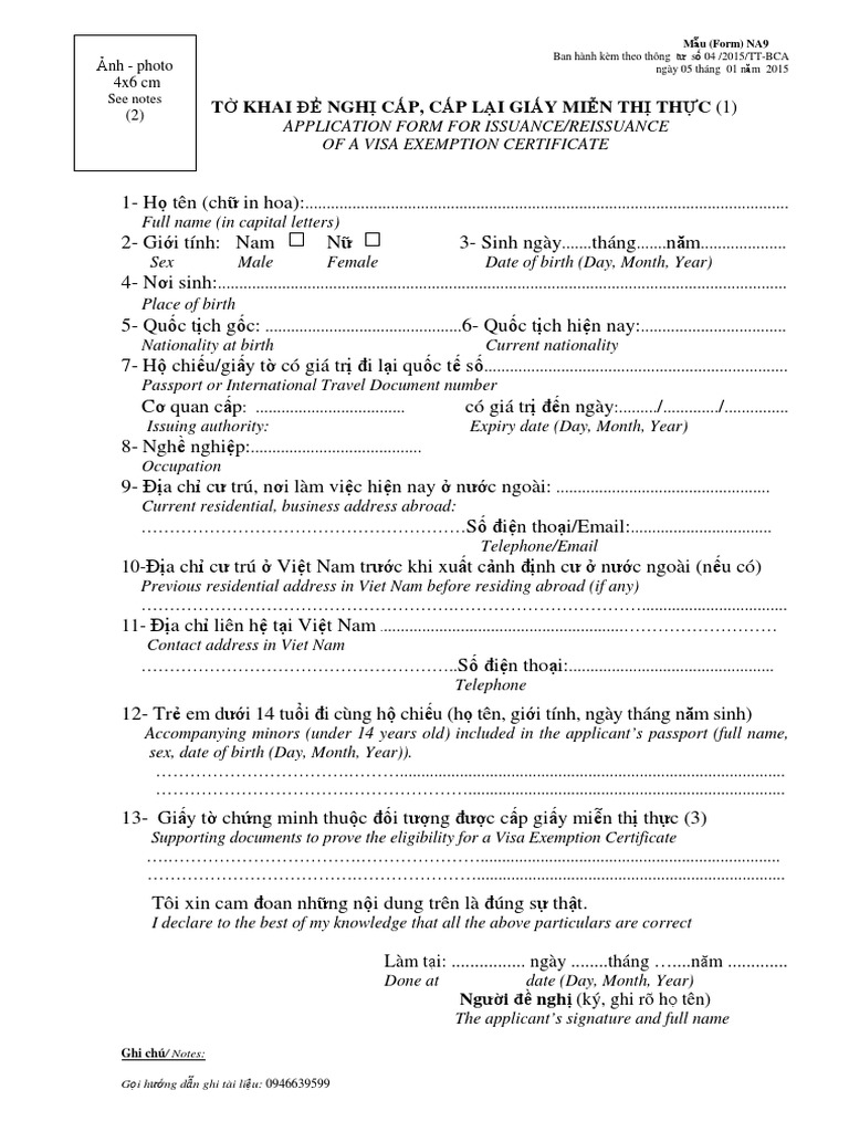 Vietnam 5 Year Visa Exemption Certificate Application Form NA9 PDF