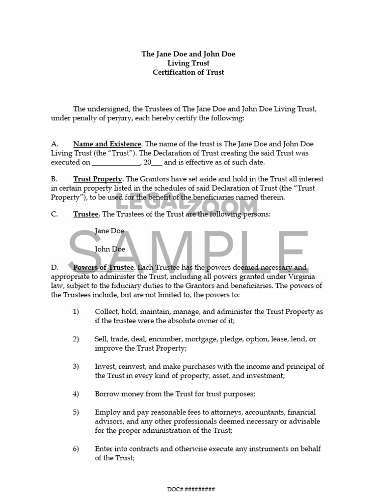 Living Trust Certification of Trust VA PDF Trustee Conveyancing