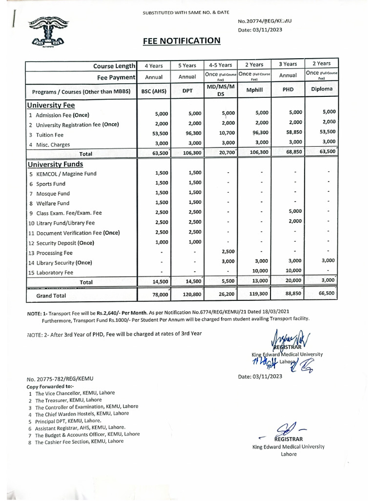 Fee Schedule for All Programs (Except MBBS) for the Session 2023 2024 PDF