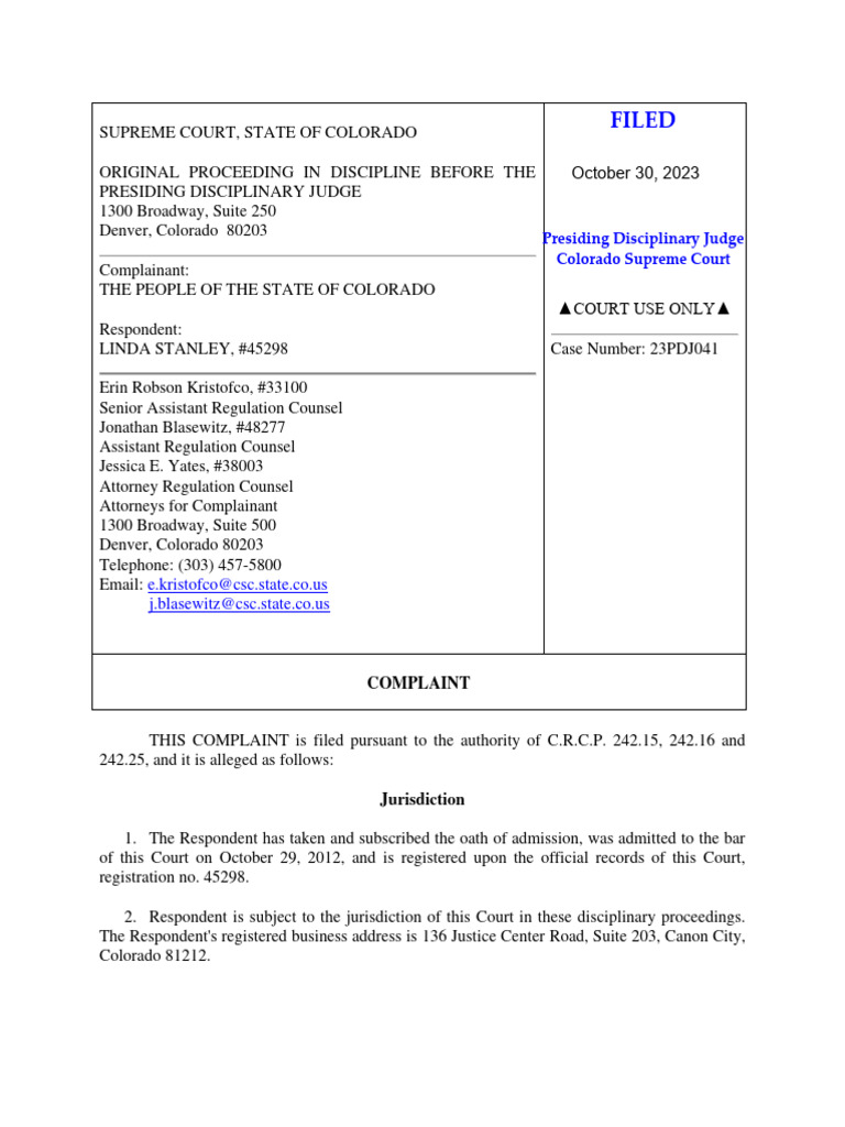 Complaint Filed in Colorado Supreme Court Regarding Misconduct by