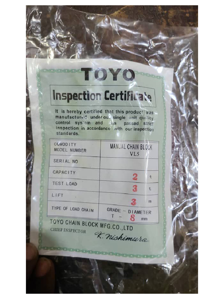 Toyo Chain Hoist Certificate PDF
