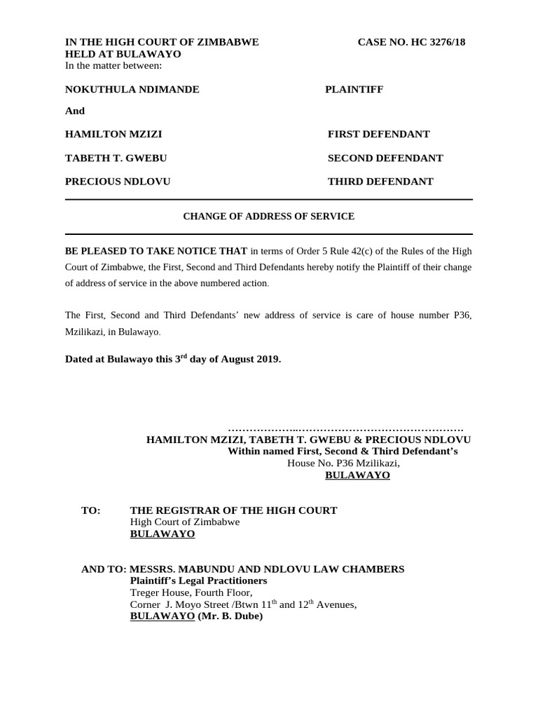 Change of Address of Service High Court of Zimbabwe PDF
