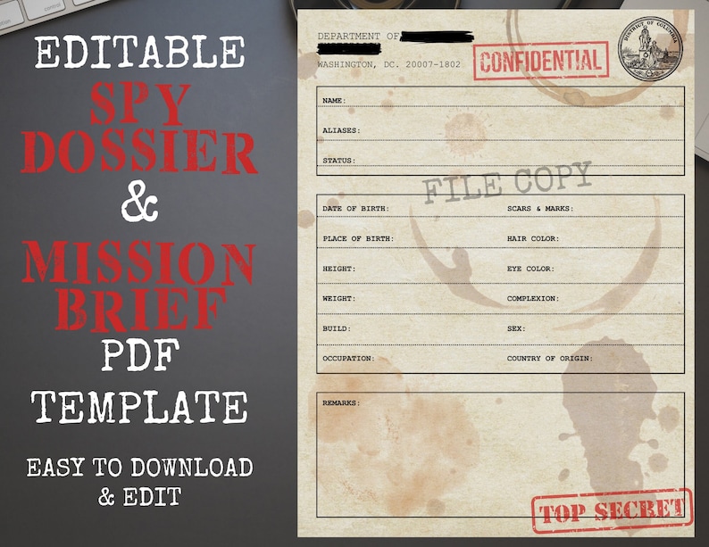 Editable Spy Dossier Mission Brief PDF Template Digital Download