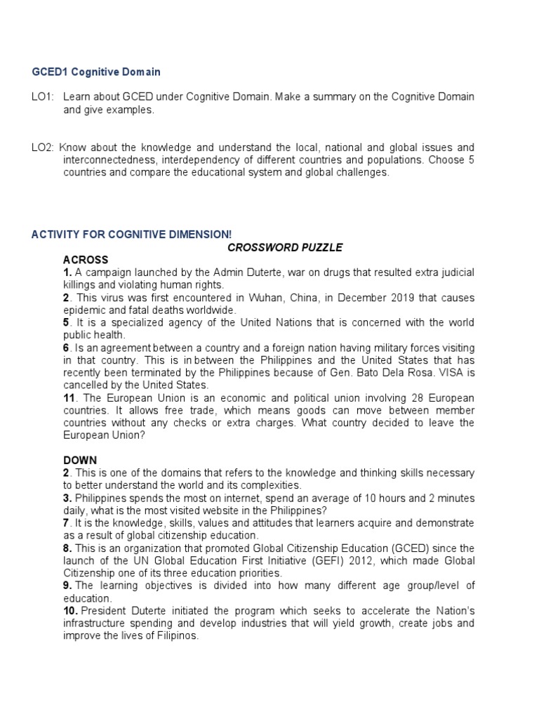 GCED1 Cognitive Domain: Crossword Puzzle PDF Further Education