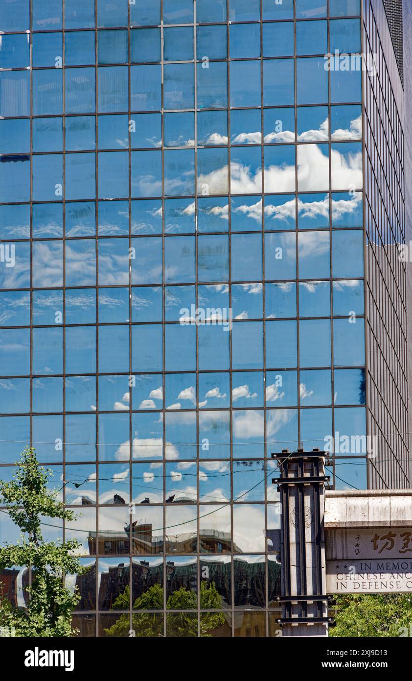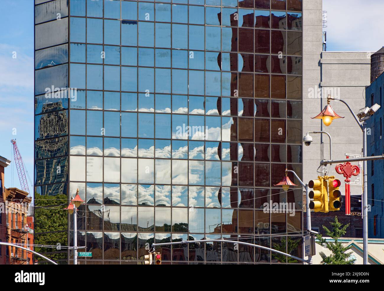 NYC Chinatown: The black mirror glass skin of 2 Mott Street provides