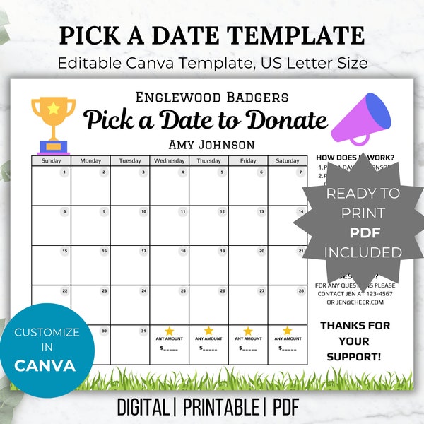 Editable Cheer Calendar Pick A Date to Donate Fundraiser Canva Template