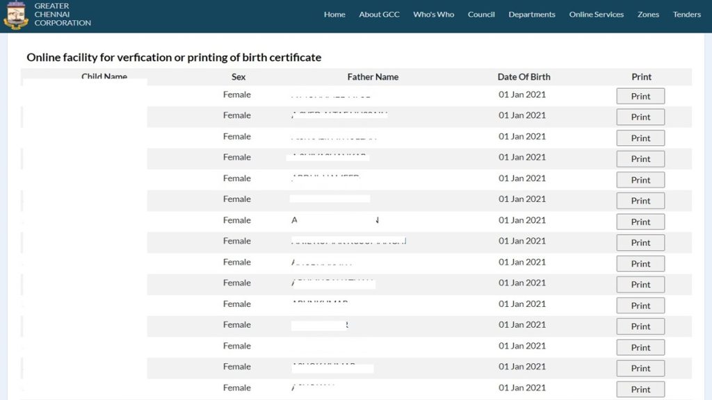 Chennai Corporation Birth Death Certificate Details online for