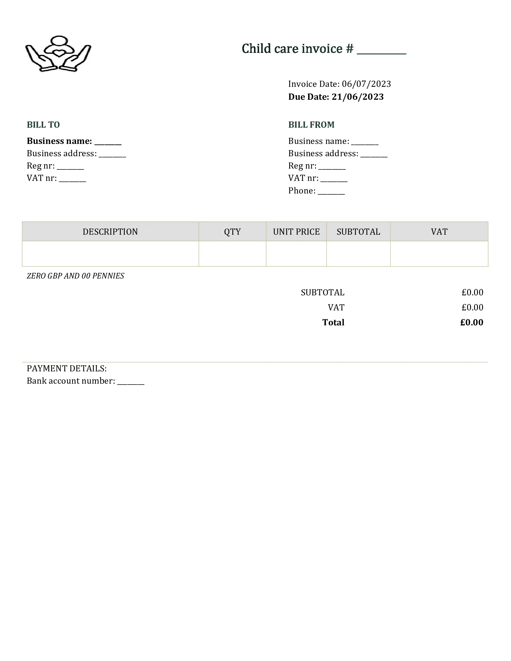 Simple Child Care Invoice Template UK PDF