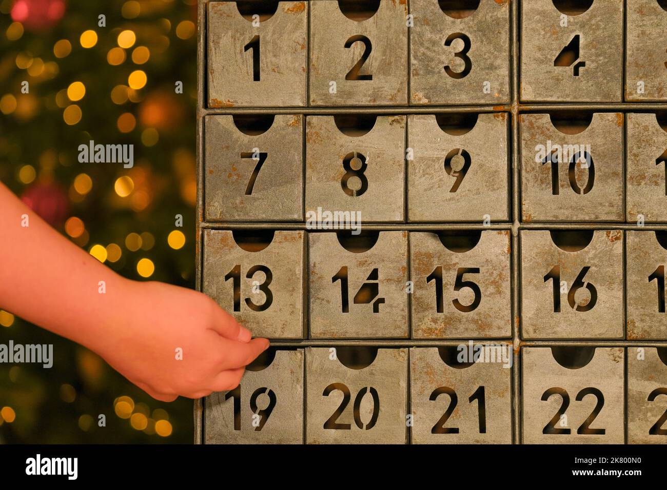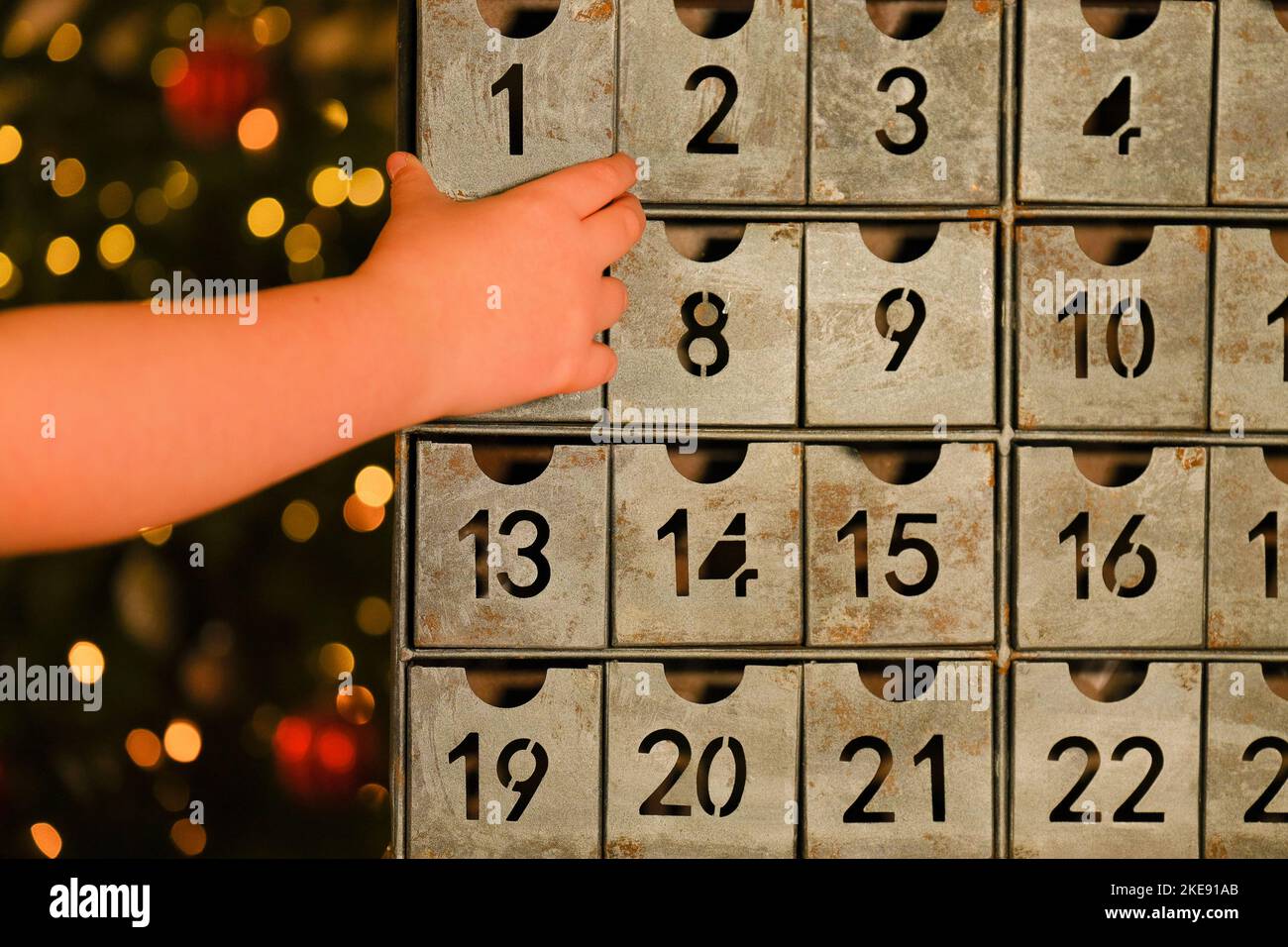 advent calendar in vintage style and childs hand near Christmas tree