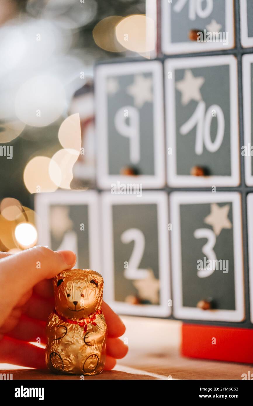 Metallic advent calendar in vintage style and childs hand Christmas